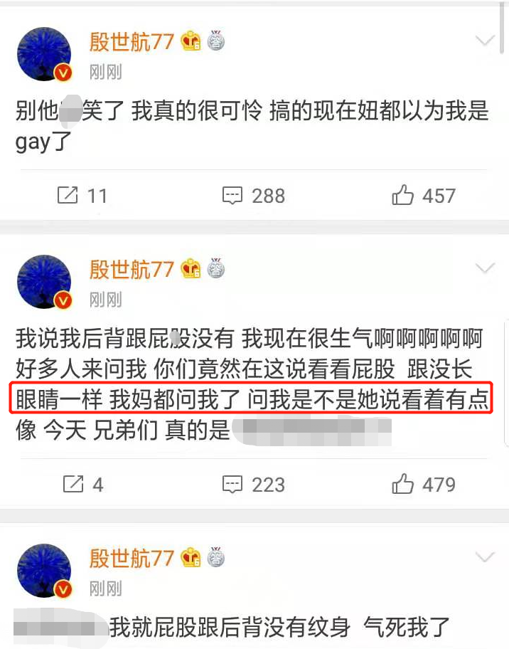 gv的主角脖子纹身和殷世航的挺像的。殷世航只好说自己屁屁跟后背没有纹身,力争自己不是gv主角。