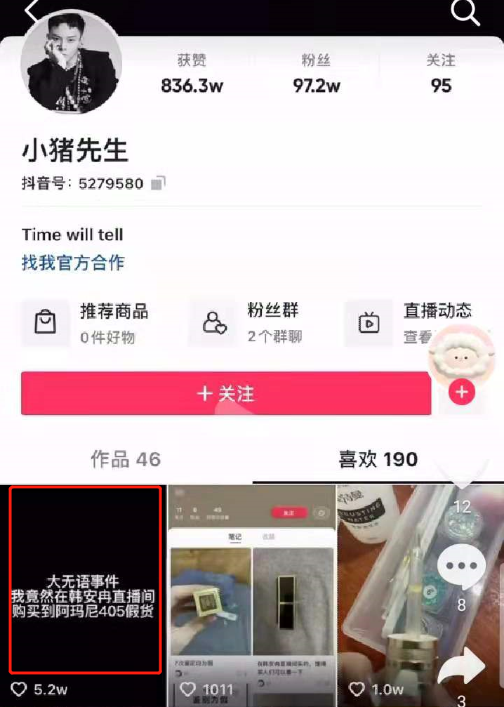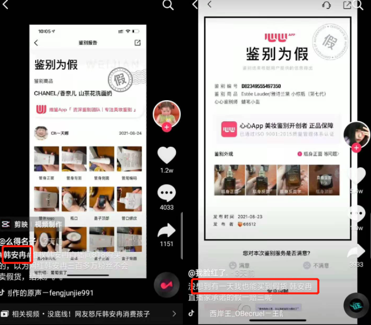 最近818活动,韩安冉带货专柜化妆品翻车了。网友把化妆品拿去鉴定app上测,测出来的结果是假货,于是发视频diss韩安冉。