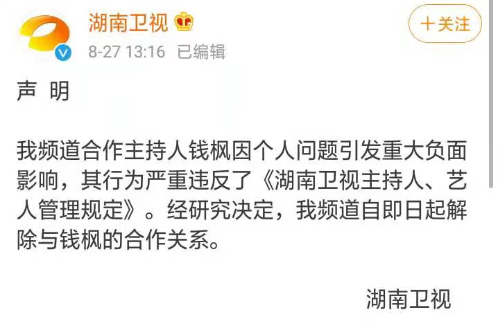 钱枫后脚就发,个人原因引发舆论,对芒果台造成不良印象,决定提交解除合作关系报告。