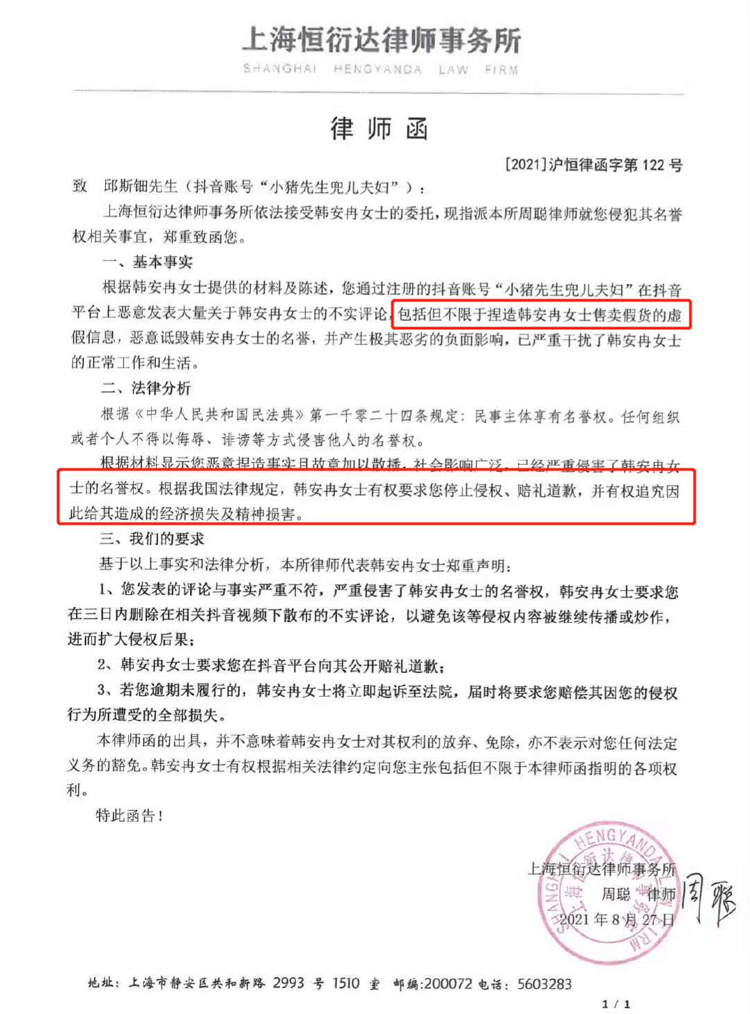 韩安冉被网友diss卖假货好几天了,没怎么正式回应过,一回应就甩律师函。