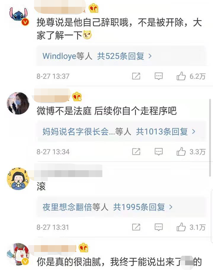 有评论说:“挽尊说是他自己辞职喔,不是开除,大家了解一下”。高情商:提交解除合作关系报告,低情商:挽尊。