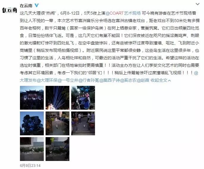 根据网友“在云南”爆料:6月9日晚有游客在艺术节现场看到让人不悦的一幕,本次艺术节喜洲音乐分会场选在喜洲古镇老戏台,距老戏台不到50米处有多棵百年老榕树,数千只鹭鸶(国家一级保护鸟类)在树上栖息安家,营巢筑窝。它们日出倾巢四处觅食,日落纷纷结伴飞返。可是,这几天它们有巢不能回!它们深夜被近在咫尺的摇滚轰鸣声、刺眼的激光镭射灯惊吓到四处乱飞,在空中盘旋惊叫,还有些被惊吓过度导致撞墙、呕吐、飞到附近小商铺里。