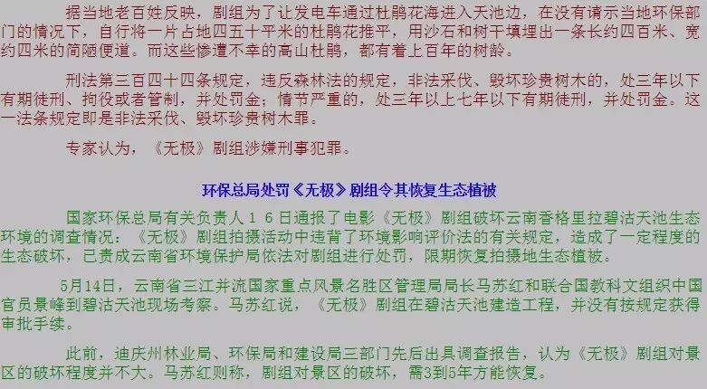 事实上,文化艺术活动影响生态引发争议,这已不是头一次。就有网友翻出了当年陈凯歌拍《无极》,在香格里拉的碧沽天池搭景,破坏当地环境的往事,并留言称“这是打着文艺旗号污染云南,真正热爱一个地方,是懂得尊重和保护它”。