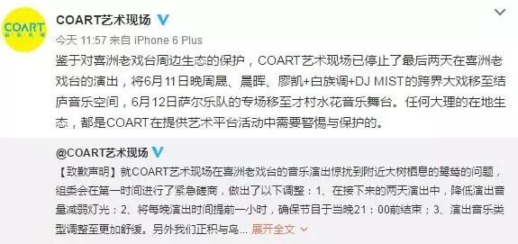 6月11日,COART艺术现场在官方微博上发表了致歉声明,活动负责人也在接受记者采访时表示在接下来两天的演出中将采取措施,包括将结束时间从22:00调整到21:00,降低音量、减弱灯光、演出更舒缓的音乐等,并表示,“我们正积与鸟类学家与声学专家沟通,就此问题听取专家建议”。