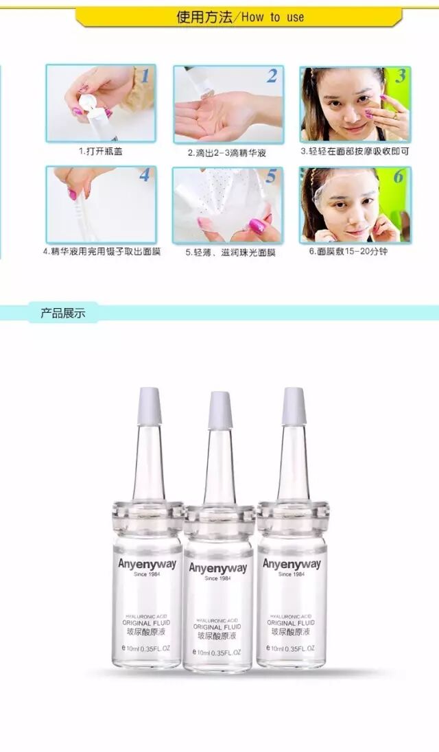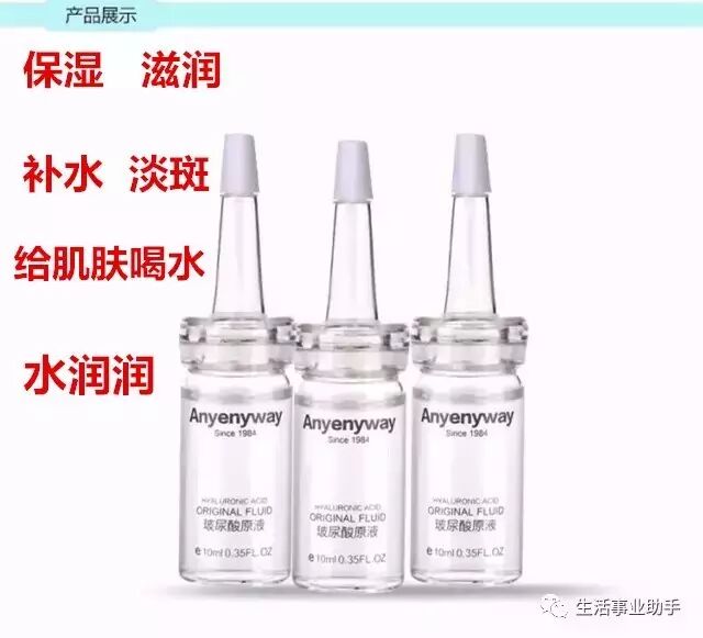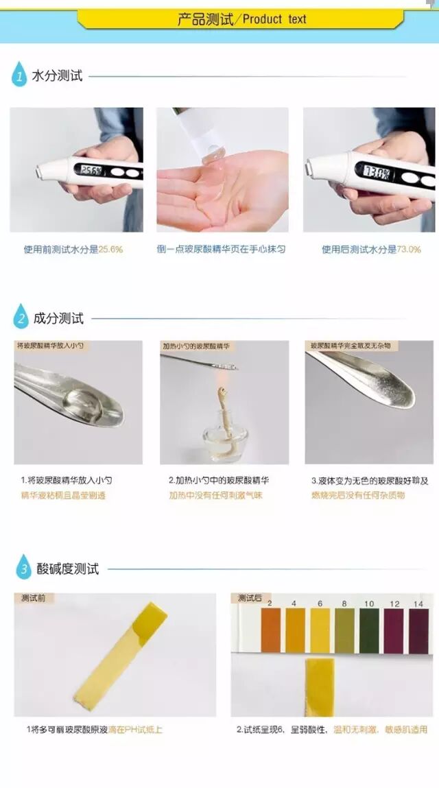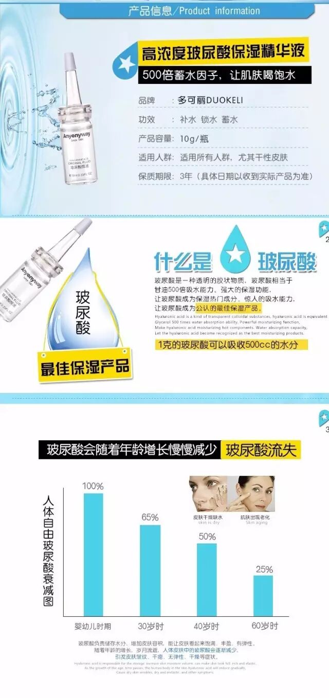 透明质酸是天然高效保湿因子,与人体皮肤亲和度高,能提高肌肤吸水、锁水能力,修复受损肌肤,促进肌肤血液循环,深度滋养肌肤。本品无任何化学添加,无刺激,适合各种肤质使用。若口服经消化系统吸收,更可补充体内缺少的透明质酸,从真皮层锁定水分,对抗岁月痕迹,再造完美肌肤。