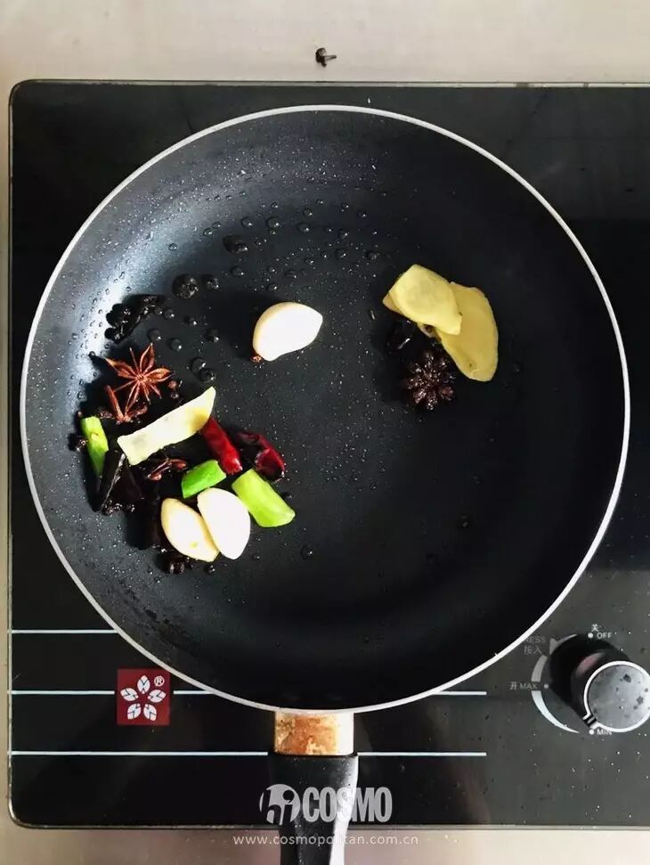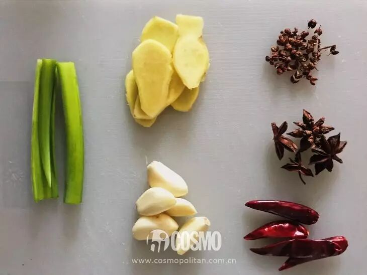 原料:葱,姜,蒜,大料,辣椒,花椒,生抽,老抽,料酒,白砂糖,食盐