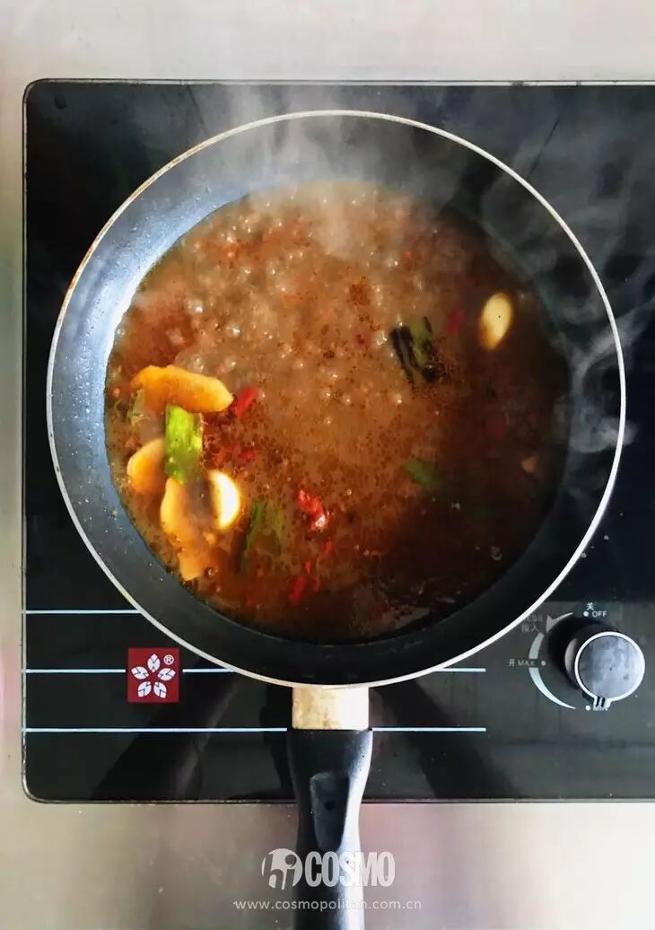 3.倒入速冻小龙虾配好的汤汁,直至沸腾;