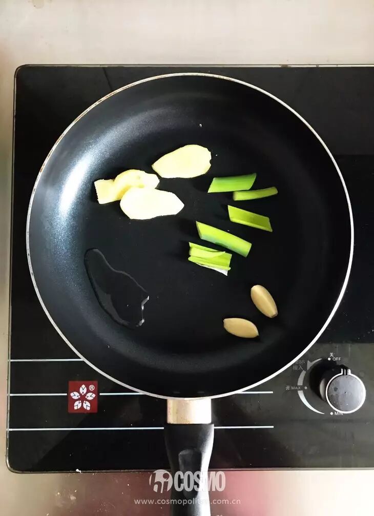 2.中火热锅热油,将切段的葱,切片的姜和蒜放入其中煸炒,直至出香味;