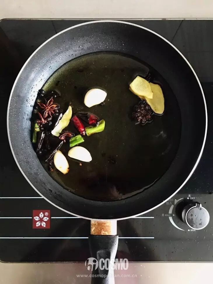 1.中火热锅热油,将切段的葱,切片的姜,蒜,大料,辣椒,花椒放入其中煸炒,直至出香味;