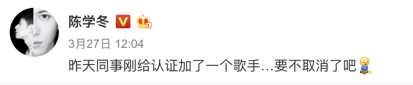 甚至刚被同事认证的歌手title,陈学冬也不敢要了,