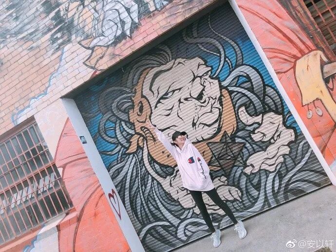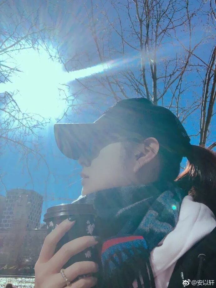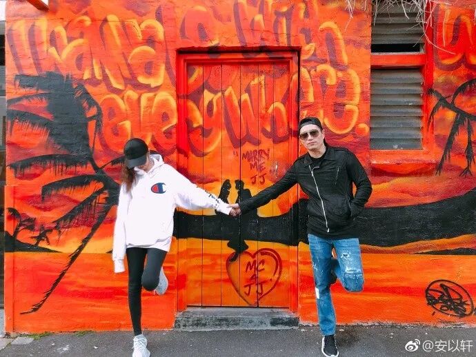 除了有安以轩的街头游客照,还有她和老公牵手照。