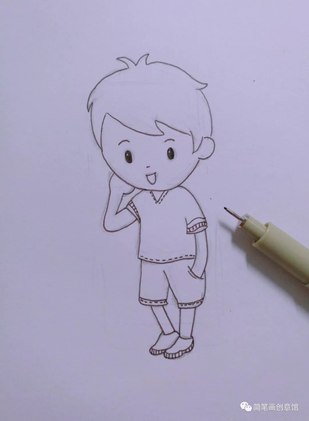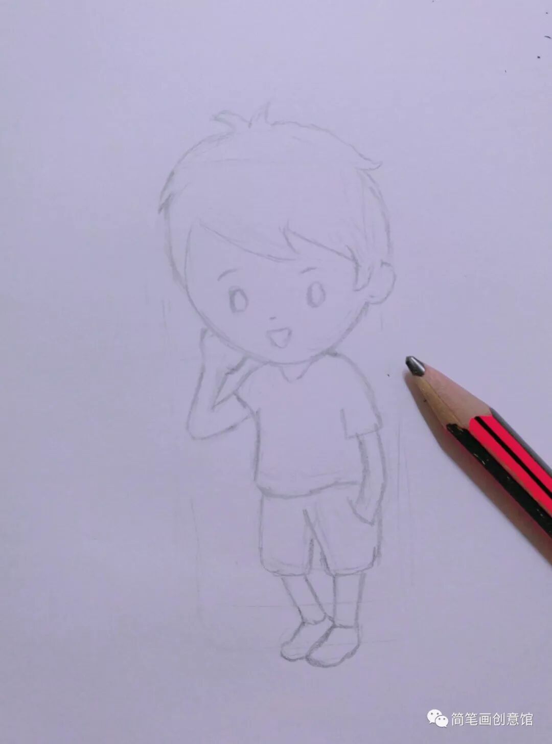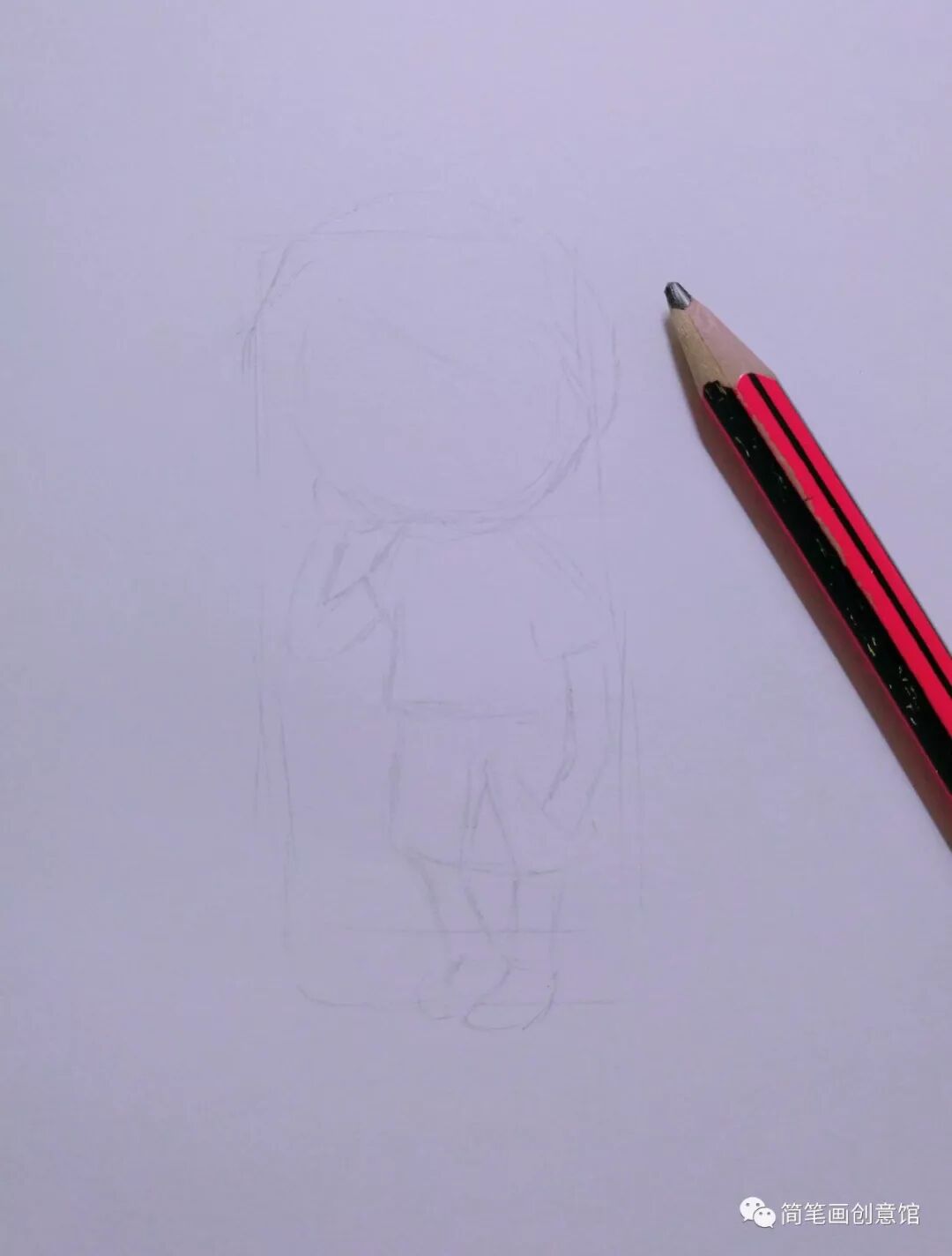二:参考原图的动作、表情、服饰,记得去繁化简原则,把身材比例和只要特征,按照头身1:1.5比例,用铅笔起稿,把手整体看成椭圆形,这图算是比较好画的,因为一只手藏在口袋里了。