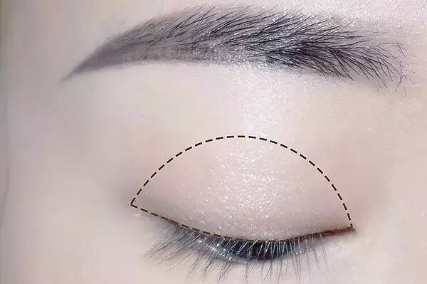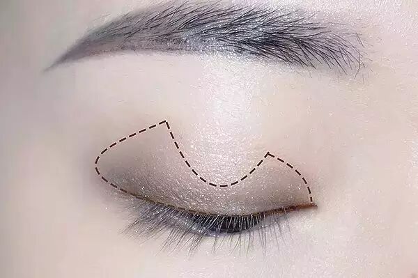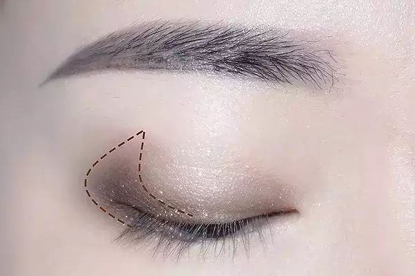 Step 5 再用小刷子,蘸取浅咖啡色珠光眼影,在眼尾和眼头画上阴影,范围如图所示