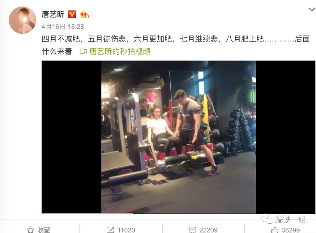 一姐不认同身高160,体重超过100就是胖这个观点。以唐艺昕现在对健身的认知水平,等下锻炼一段时间,体重秤上的数字怕是会吓到她怀疑人生吧。毕竟刚接触健身面临的都会是体重上涨,不坚持的话,减肥是不可能的,这辈子不可能减肥的。