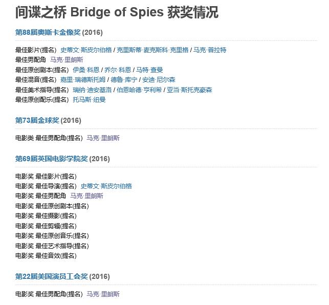 《间谍之桥》提名多项大奖,其中包含6项奥斯卡。