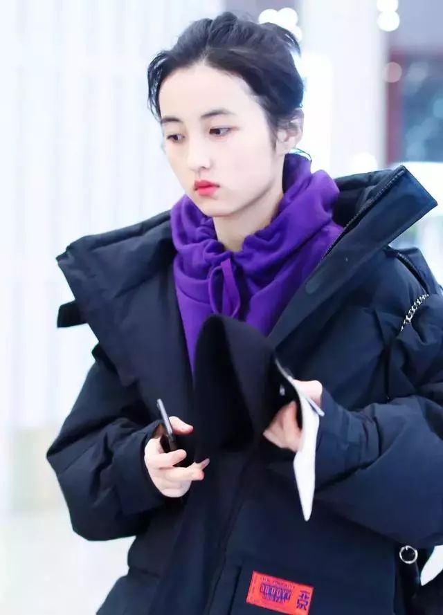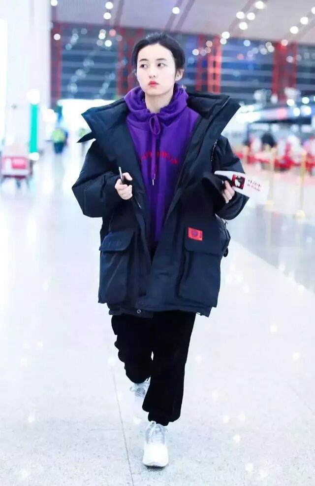 张子枫北京机场送机街拍,紫色连帽卫衣外搭黑色羽绒大衣,小脸粉嘟嘟的小可爱。