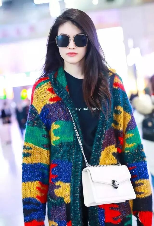何穗机场私服,身穿彩色针织衫温婉随性,Stella McCartney运动鞋随性时髦,墨镜是Dior大方框,整体穿搭高贵又有气质。仙姑美颜在线,好看!