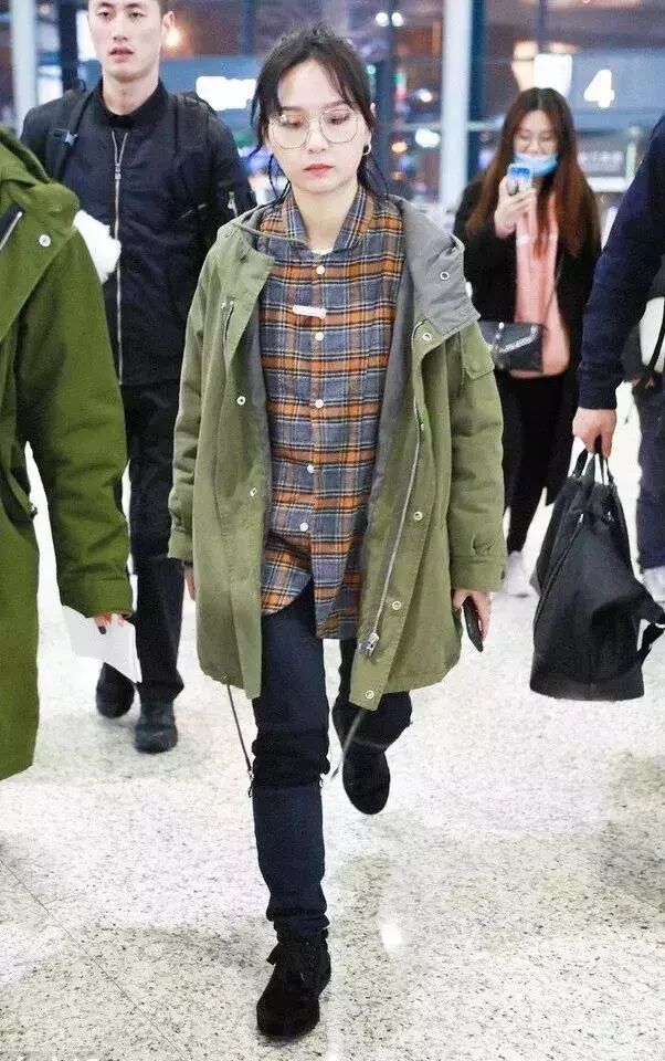 周笔畅现身上海机场,她身穿军绿色派克大衣,搭配格纹上衣和黑色长裤,小辫发型鬼马又酷炫,再加上细框眼镜,超时髦了。