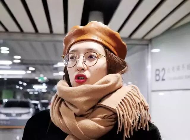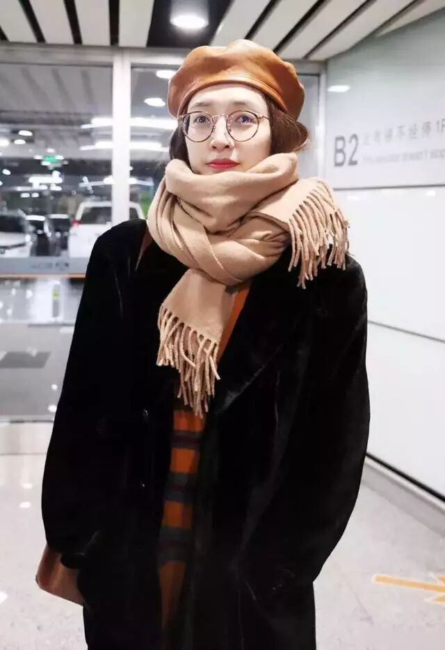 江疏影机场私服,条纹针织裙,外搭黑色丝绒长外套,系上驼色的流苏,头戴皮革贝雷帽,色彩搭配和谐,不但保暖做的好,还很好看。
