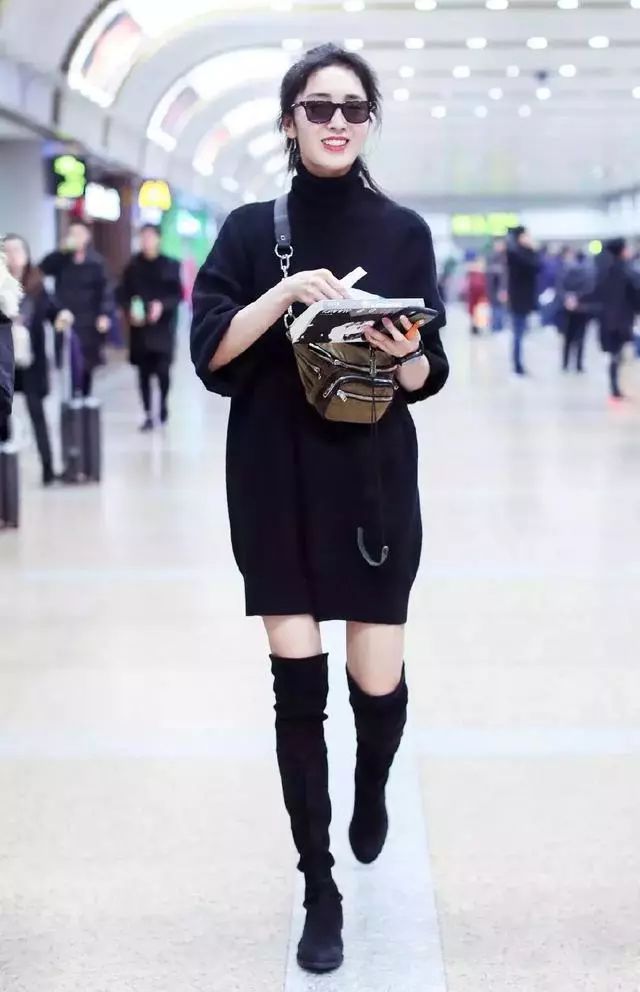 王紫璇北京机场送机,黑色高领毛衣裙搭过膝长靴,大长腿出没。