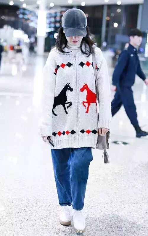 董洁现身机场,身着圣诞风毛衣搭宽松的牛仔裤,舒适不是几分少女感。
