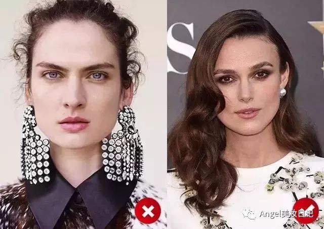 圆脸的特征是下巴短、五官较紧凑。所以在选择耳环上一定要避免圆形、椭圆的款式,不然会愈发圆润。精致小巧的耳环也不适合圆脸仙女们,会让脸型看起来更加宽哦~长款的线条形耳饰有拉升效果,一对比下来,右边的明显比左边要显瘦多呢!