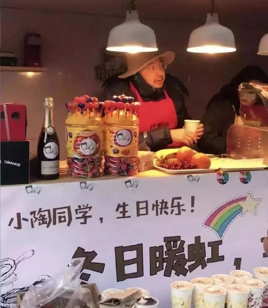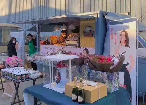 他像一个陶虹的“狂热粉丝“,在房车附近摆放陶虹的人形立牌、应援海报,现场布置鲜花、香槟、咖啡,还穿上桃红色的围裙,在车里忙前忙后准备餐食。