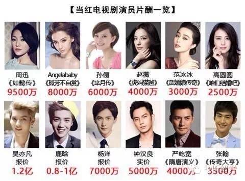 此外,新闻中还贴出一张明星片酬的列表,如周迅《如懿传》9500万,Angelababy《孤芳不自赏》8000万元,孙俪《芈月传》6000万元,赵薇《虎妈猫爸》4000万元,范冰冰《武媚娘传奇》3000万元等,数额惊人。