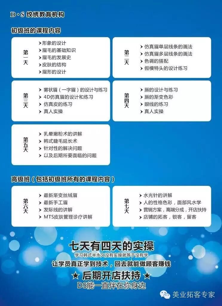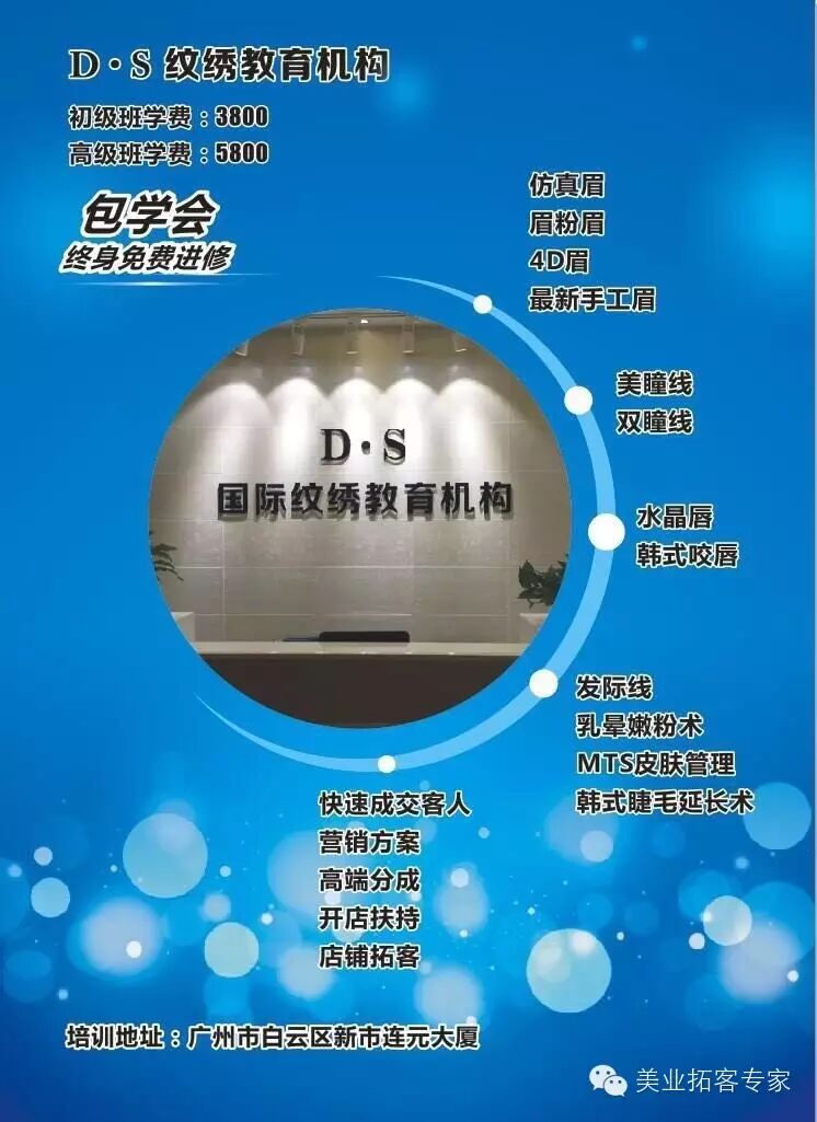 ------- 学员结业后免费提供开业,拓客指导,免费高端分成,异业联盟辅导终身免费复训进修最新半永久技术