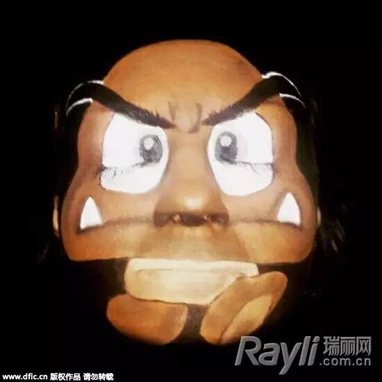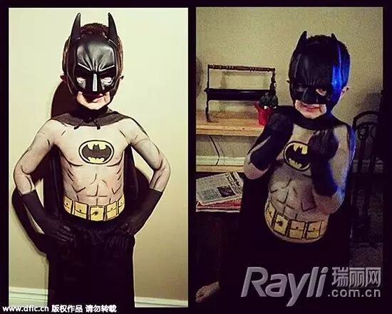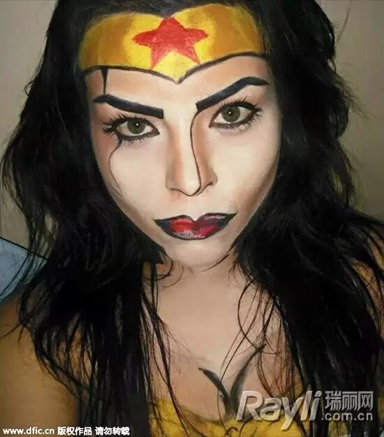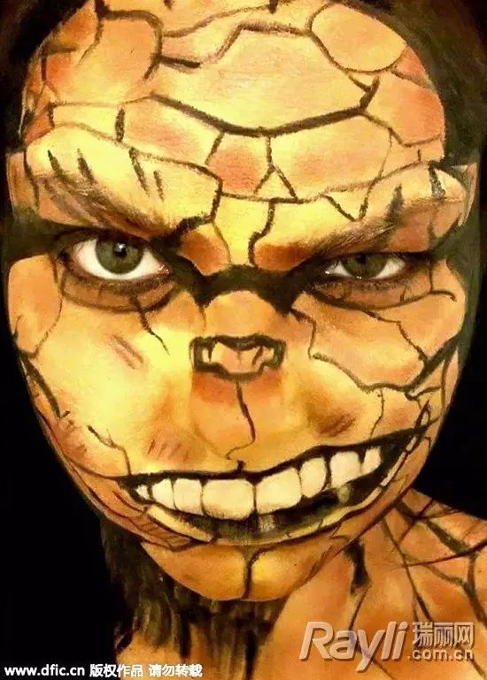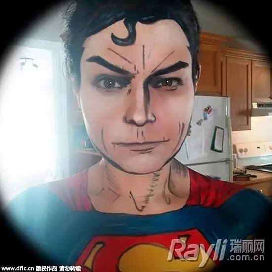 借助画笔在自己的脸上大做文章,变身超级英雄。
