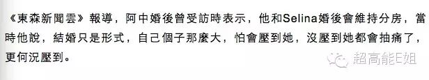 另一匿名博主爆料,阿中曾在Selina受伤后向友人哭诉,“她现在变好丑我根本不想娶她,可是我不娶她就变坏人了”……