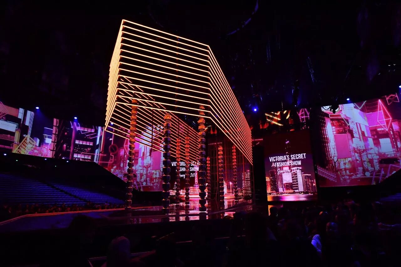 再接下来让我们一起走出后台看看现场,舞台布置还是用粉色的主基调,一根一根的led灯管搭建成一条长长的维密秀道~不知道人走在里面是不是也会变的pink起来~