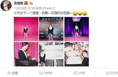 11.18号微维密展览,姗姗发微博说到:“今天许下一个愿望,我要一双隐形的翅膀~”