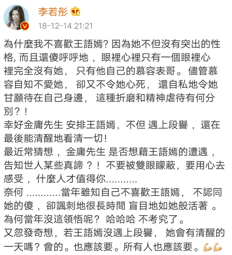 54岁李若彤孤独庆生:我演火了小龙女,却活成了王语嫣 VIKAN薇刊 港台女星 2020-08-22 19:08:34 442 创作不易,用心坚持,欢迎请BaGua喝几杯爱心咖啡!打赏并支持本文 打赏并删除本文 ↑点击上方蓝字关注卡娃微卡欢迎分享到朋友圈文/图蘼来源:慢时光(ID:manshiguang3)2020年8月16日这一天,是李若彤54岁的生日。54岁,人生已过半,李若彤对于年龄和感情都看开了,也看淡了。或许还是会有很多不理解的人问:“你为什么还不结婚?”可你不知道的是,曾经的李若彤也曾将感情看得高于一切,为了感情放弃工作,迷失自己,可到头来,还不是痴心错付,尝尽苦涩?在李若彤30年的演员生涯里,她最喜欢的角色是美若天仙的小龙女,因为她有原则、有主见、果敢。而她最不喜欢的角色是王语嫣,因为她傻乎乎的,心里眼里没有自己,只有不爱她的表哥。可是命运捉人,最喜欢小龙女的李若彤,却活成了自己最不喜欢的王语嫣。 没有野心,误打误撞的进入娱乐圈 李若彤就如同小龙女一样,从小就拥有盛世美颜。天生就有点混血儿的外貌,高鼻梁,大眼睛的,好看的都不像是父母亲生的。或许就是因为这天赐的美貌,在1990年,还在做空姐的她被星探发掘,开始接拍一些广告,赚点外快。90年代,《香港小姐》正当火,很多漂亮年轻的小姑娘都跑去参加《香港小姐》,从而进入娱乐圈。可李若彤却完全志不在此,她只是偶然空闲时才会去赚点零花钱。在被徐克导演相中去和黎明、张学友、李嘉欣合作拍电影《妖兽都市》的时候,所有人都以为她定会好好把握住这次机会。可没想到,一拍完,她就立马回去当回了空姐。就连电影宣传的时候,李若彤都是直接拒绝,理由是她要和男朋友去旅游。工作人员都惊呆了,问她:“你知道自己在干什么吗?”所以当时施南生评价她说:“演技不俗,也有潜质,就是缺了点野心。”这样没有野心的李若彤,就想好好当空姐,和男朋友一起甜甜蜜蜜,可就这样简单平常的愿望,她都实现不了。在19岁这一年,她与男朋友分手,正伤心时她却大病一场,想休息公司却不给批假,她干脆就辞掉了空姐的职位,转而去当演员。俗话说:“上帝给你关了一扇门,却总会再为了打开一扇窗。”当空姐不如意的李若彤,当起演员来却顺风顺水。1993年,李若彤凭借电影《火烧红莲寺》正式踏入娱乐圈,之后更是拍了多部电影,让她小火了一把。但要说真正让她出圈的,还是《神雕侠侣》中的小龙女一角。1995年,金庸亲自钦点让李若彤出演小龙女。要说经典角色难以逾越,有赵雅芝的白娘子,有王祖贤的聂小倩,也一定有李若彤的小龙女。看了定妆照后,金庸就赞不绝口地说:“这就是我心目中的小龙女。”李若彤版本的小龙女,成了无数观众心目中最美的小龙女,无可超越。而之后《天龙八部》的王语嫣、《杨门女将》的杨八妹,更是让她成为无可替代的一代女神。这么多年过去了,尽管有很多翻拍的“小龙女”“王语嫣”出现过,可却始终超越不了李若彤的版本。或许这就是经典吧。可是经典也是通过人的努力而达到的,李若彤拍戏非常认真。拍《神雕侠侣》的时候,小龙女有非常多的打戏,她不用替身,亲自上阵,就算是拍到全身淤青也丝毫没有抱怨。她说:“我接了这个工作,我就要把它做得很好很好。”没有野心的她,做起一件事来,却分外的努力。或许,这就是她在演艺路上顺风顺水的原因吧。为了爱情,放弃了如日中天的事业,却惨遭抛弃 对于演戏,李若彤一路拼荆斩棘、过五关斩六将的,冲到了高峰。可正当她的演艺事业如日中天的时候,她却悄然退去,洗手作羹汤。1998年,李若彤与商人郭应泉相识、相恋。有大男子主义的郭应泉,不喜欢李若彤出去“抛头露面”,于是让李若彤退出娱乐圈,乖乖呆在家里。为了让男友安心,没有野心的李若彤欣然接受了这个安排。谁能想的到呢?那个昔日红遍大江南北的“小龙女”,如今甘愿24小时围着男友转,只要对方一个电话,就算是正在和朋友聚餐,都会立刻飞奔过去。当她觉得生活太无聊的时候,想偶尔出来工作,还要一而再地央求他的同意。在郭应泉遇到财务危机时,她还毫无保留地帮对方一起度过难关。张爱玲在送给胡兰成的照片背面写道:“在你面前我变得很低很低,低到尘埃里。但我的心里是喜欢的,从尘埃开出花来。”这时候的李若彤就是这样的,在郭应泉面前变得很低很低,为了他放弃很多东西,但心里却又是欢喜的,因为她爱他。李若彤就这样与郭应泉相伴十年,这十年来,李若彤都以对方为主,始终相伴不离不弃。可有时候誓言说变就变,当郭应泉的新鲜感过去了,一句“不合适”就斩断了两人十年的情根。原来,爱真的会变。最开始的时候,李若彤想不通,也恨过他,可后来又想:“如果我恨他,我会快乐一些吗?原来不会。”于是这个傻姑娘就将恨化为难过,一个人默默承受,在很多个日夜里,她不知道失眠了多少次、流了多少眼泪。可在她还来不及整理自己的心情之时,不幸却接二连三的到来。分手半年后,她爸爸中风了,刚失去爱人的她再也承受不起失去亲人的痛苦,于是她费尽一切心力,想让父亲好起来。她整日守在病床前照顾父亲,端茶递水,喂饭喂药,学着插喉,可再悉心照顾还是没能挽回父亲生命。在这接二连三的打击之下,李若彤抑郁了。她患了很严重的抑郁症,那段时间,她无法控制自己的情绪和身体反应,她有过很多次自杀的念头,她经常想:要不一了百了算