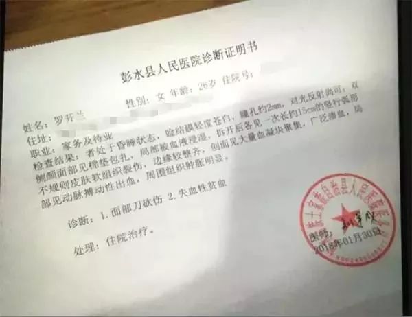 彭水县人民医院1月30日出具的诊断证明书显示,罗开兰脸部“各见一次长约15cm的竖行弧形不规则皮肤软组织裂伤,边缘较整齐,创面见大量血凝块聚集,广泛渗血,局部见动脉搏动性出血,周围组织肿胀明显”。