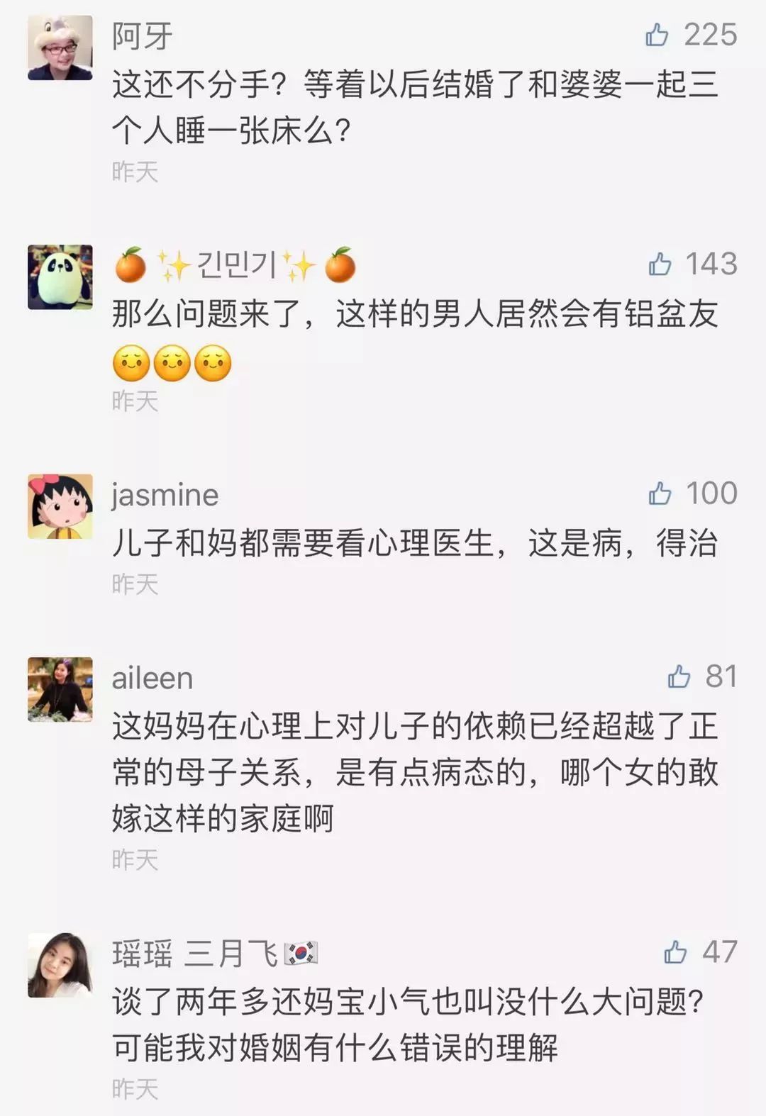 王小姐很苦恼,她问大家这是什么家庭?妈妈难道就要儿子陪着才能吃饭睡觉吗?