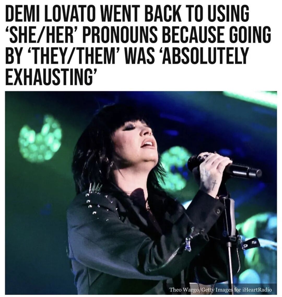 最近,曾是非二元性别的美国女星 Demi Lovato(黛米·洛瓦托)表示,自己未来将使用女性的称谓“She/Her” 来指代自己,而不是非二元性别的称谓“They/Them”,原因是不断地向人们解释什么是非二元性别太累了,她没有这个精力去做这种活得太累的事情。因为美国人大部分人都思想保守,所以为了好好地社交,她决定放弃非二元性别的称谓“They/Them”。