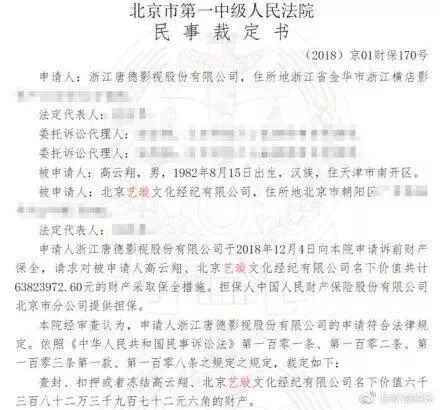 近日,有媒体发出消息称,高云翔被唐德影视索赔,6000多万巨额资产被冻结,原因是之前高云翔与范冰冰出演的《巴青传》如今因为两人的原因不能再播出,因此要求索赔。