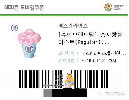 韩国网友已经替你们试过啦!只需要从Gmarket上面购买芭斯罗缤冰激凌的优惠券,然后去店里扫码就可以啦!