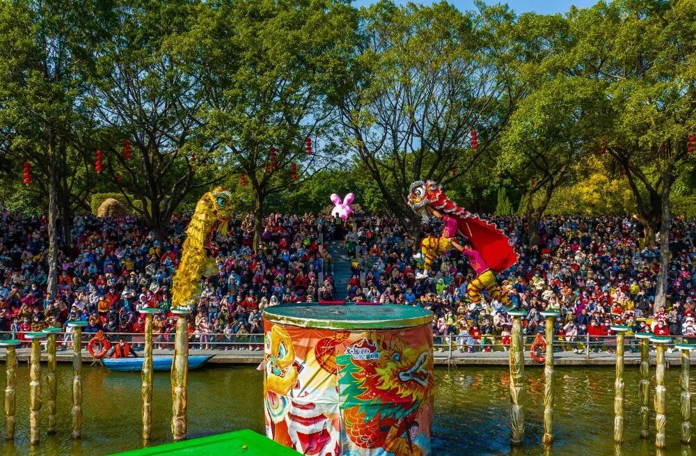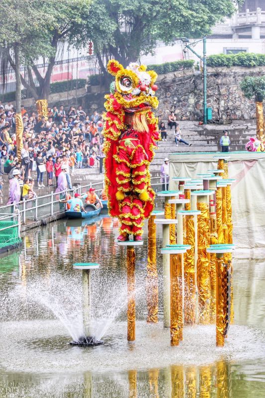 春节期间,众多游客观赏南海西樵山天湖水上高桩醒狮表演。
