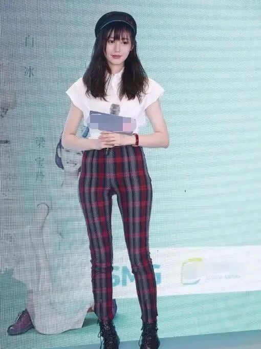 一件白色的衬衫看起来挺清纯的了,搭配了一条格子的裤子显得分外的英伦风,但是这个裤子是那种紧身的显得她的臀部加倍的大,因此看起来就跟穿紧身裙同样分外的为难了呢,分外不适用她身段的一条裤子了。