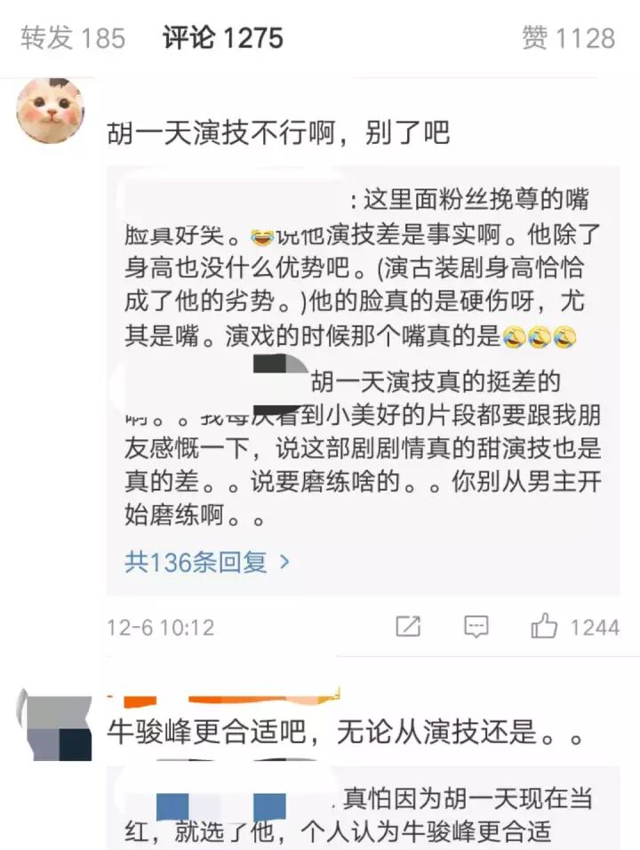 而凭借《致我们单纯的小美好》中江辰一角走红的胡一天的演技则被一干群众质疑。