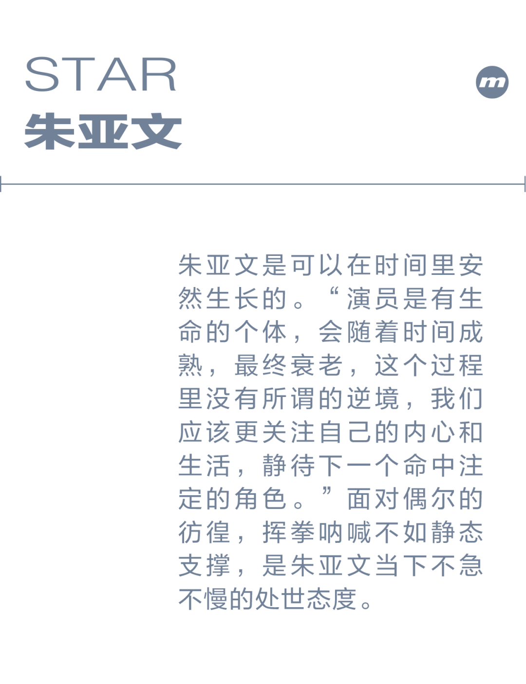 近几年较少在公众场合露面的朱亚文,开始精简自己的社交与工作,演员同样是生存在自然规律下的生命个体,会随着年龄变化发生职业定位的转变:“我仍然在忙碌,也在为下一个命中注定的角色作准备,但这种准备更多是对自己内心的关注,和生活的观察。”十年前,他接到“余占鳌”这个角色的时候,用他自己的话说,是“一身的野劲儿”,就连对角色的创作也是野性、自由的。“那个时候市场需要我更有线条感,我在健身房一呆可能就是半天过去了。但现在,我想即便是再有一个‘余占鳌’出现,这个机会也不一定还属于我。有人可能认为,这是不是代表着一种逆境,我说不,这是在自然规律下,演员这个职业应该也一定会具备的思想变化。如果我硬要逼着自己,去出演当时那样的角色,那种创作反而可能是畸形的。”