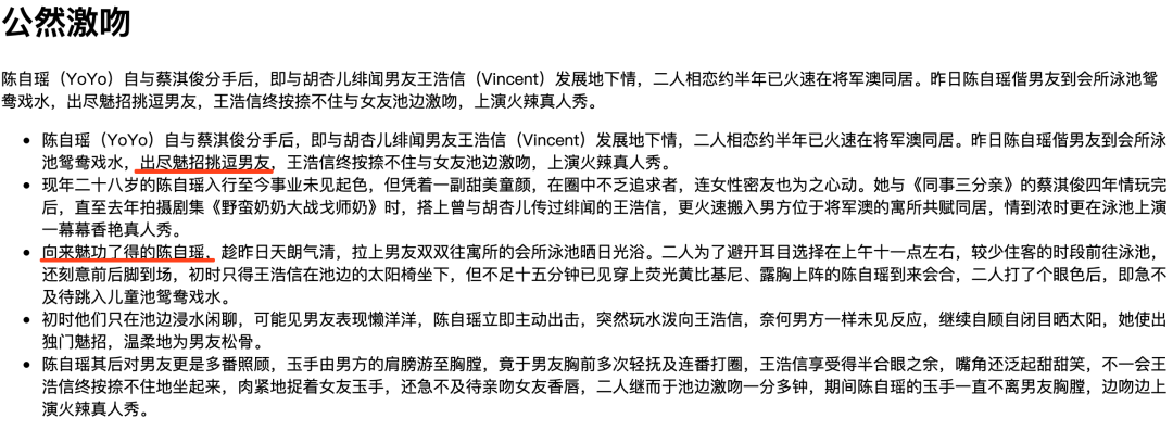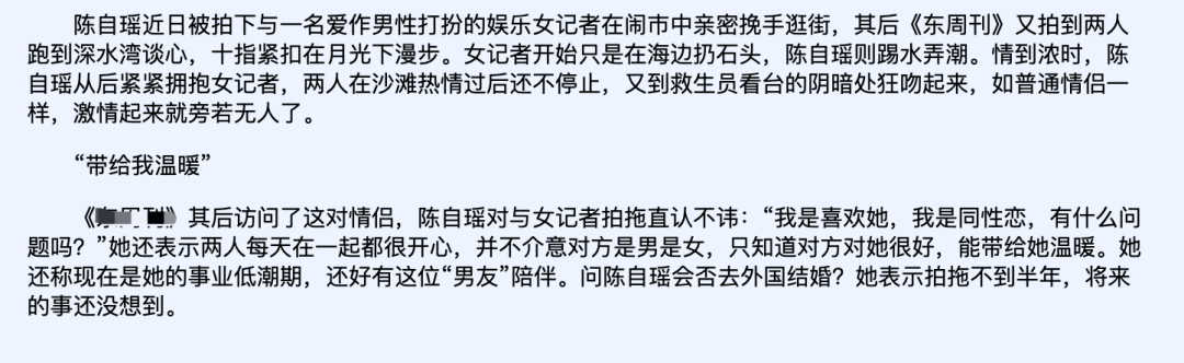 和王浩信谈恋爱时,媒体对她的报道是这样的:“出尽魅招挑逗男友”“向来魅功了得的陈自瑶……”