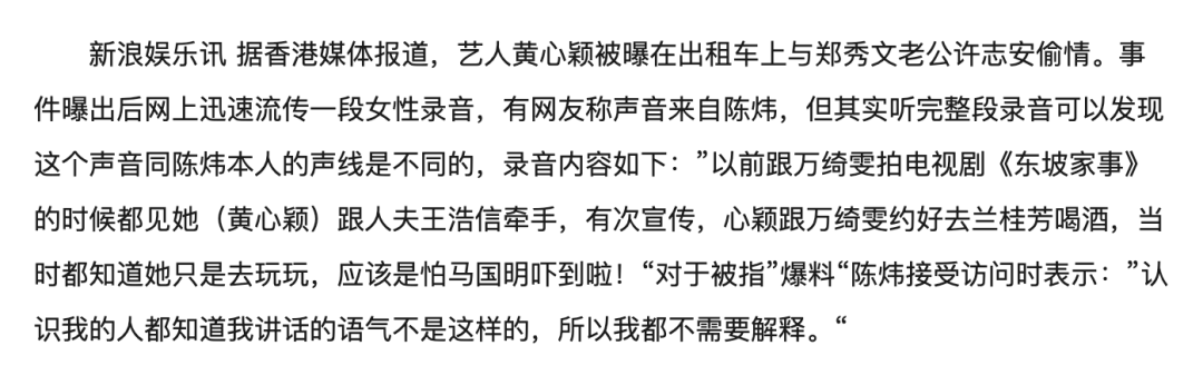 而黄心颖被爆和许志安偷情的时候,网上也传出一段录音,说王浩信和黄心颖曾手牵手,对此,疑似“爆料人”的陈炜否认那是她的声音。