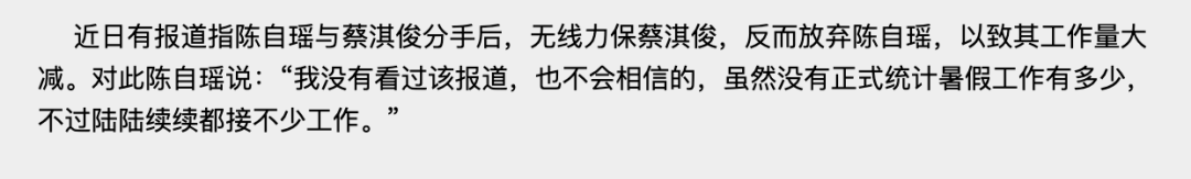 结果网传无线选择保蔡而弃陈自瑶……对此陈自瑶说,自己不相信那些报道,一直陆续有在接工作。