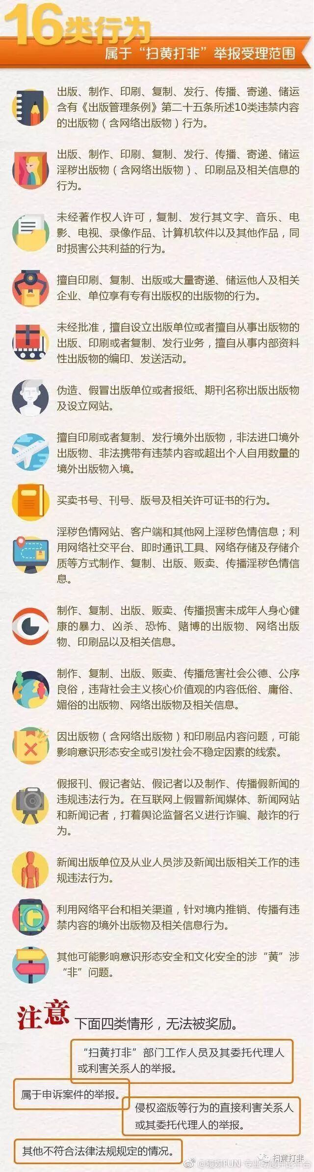 1,新版《“扫黄打非”工作举报奖励办法》今日起施行,16种行为属于举报受理范