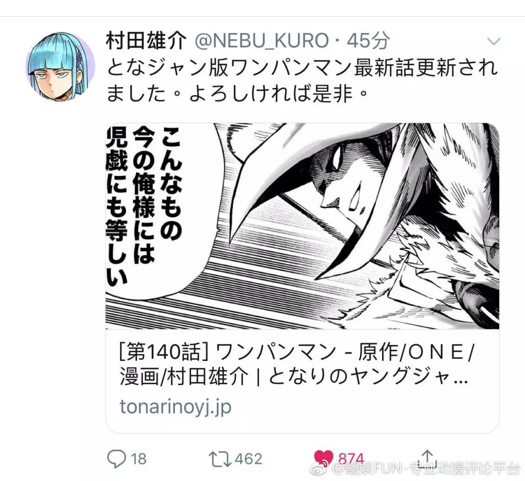村田雄介重制版《一拳超人》第140话现已在tonarinoyj.jp更新。