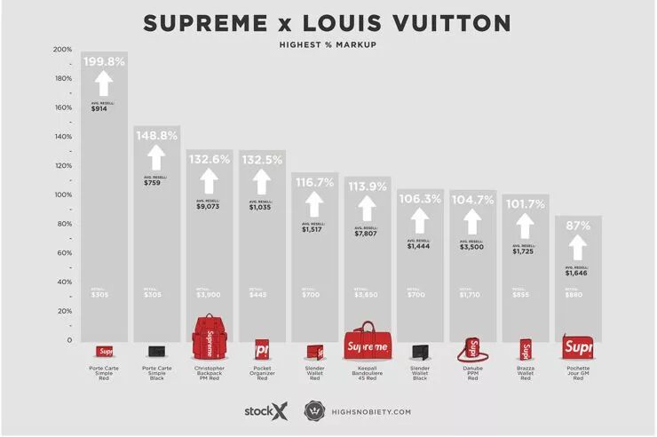 17年与Nike Air More Uptempo、LV联名带来了巨大的收益,跨界合作大幅提升了知名度、业绩也跟着上涨,LV x Supreme已创造了超过一亿欧元的销售额。