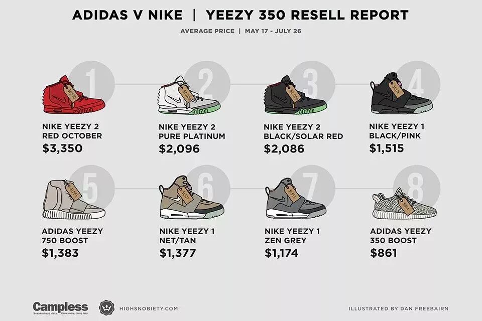 Yeezy先是和BAPE合作,接着是Nike,最开始的天价红色椰子鞋就是这样火了起来。后来Adidas高价签走侃爷,一起出了这个天价鞋子:Boost 350。